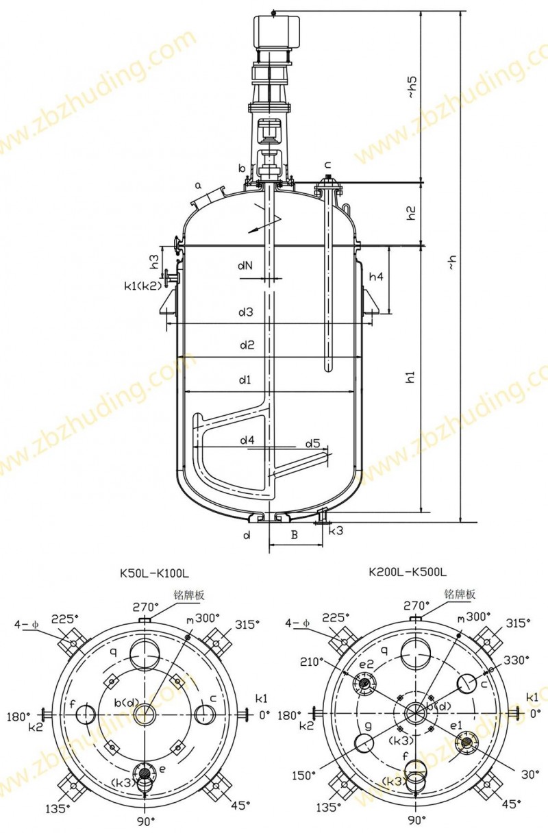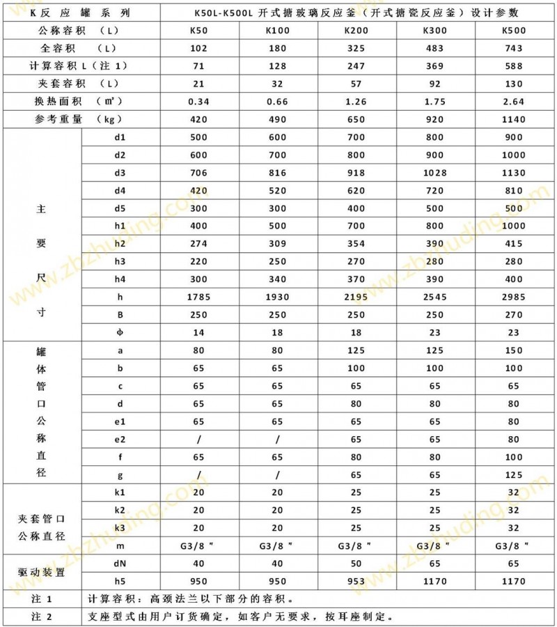 K50L-K500L開式搪玻璃反應(yīng)釜(開式搪瓷反應(yīng)釜)設(shè)計圖紙及參數(shù)如下所示: