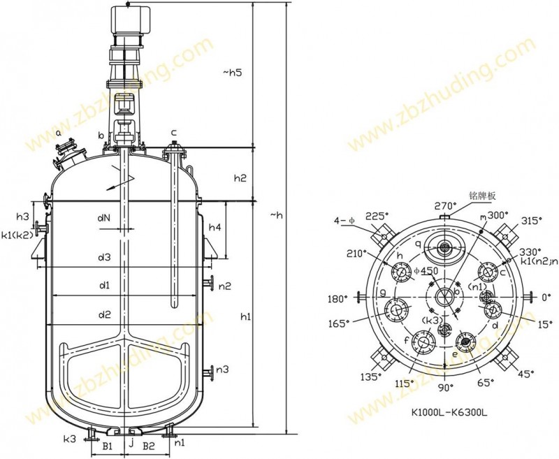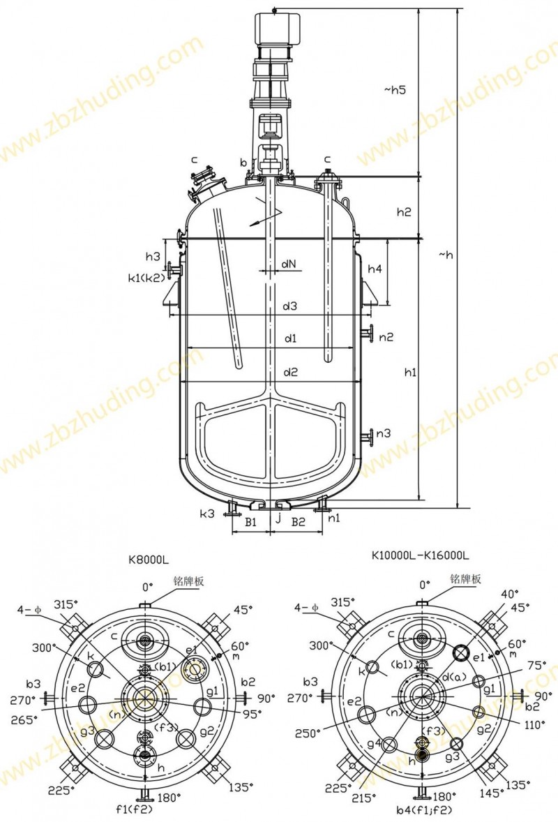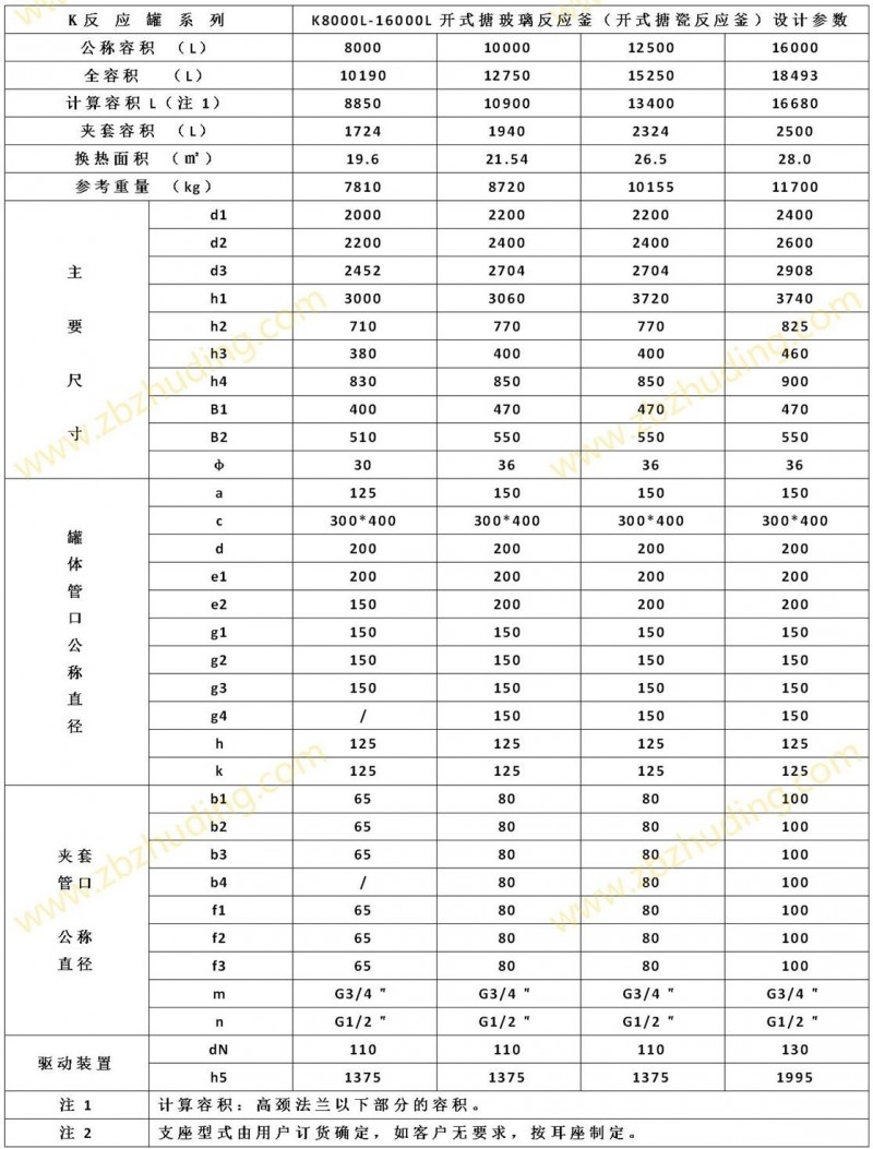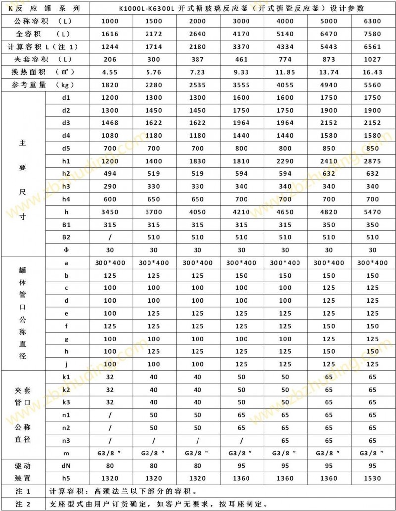 【K型搪玻璃反應(yīng)器的技術(shù)參數(shù)】: K1000L-K6300L開式搪玻璃反應(yīng)釜(開式搪瓷反應(yīng)釜)設(shè)計圖紙及參數(shù)如下所示: