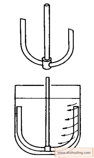 適用于粘度在100Pa·s以下的流體攪拌,當流體粘度在10~100Pa·s時,可在錨式槳中間加一橫槳葉,即為框式攪拌器,以增加容器中部的混合。