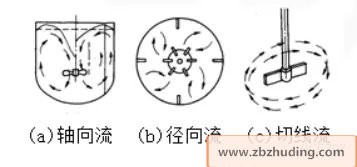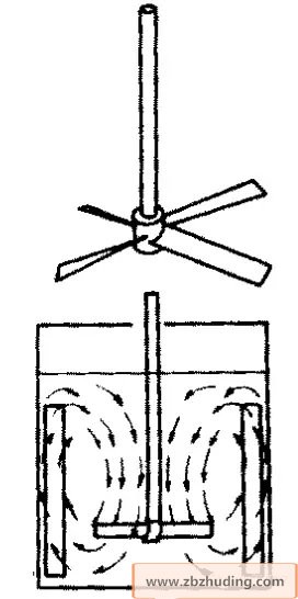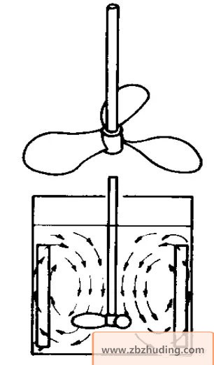 流體流動方向平行于攪拌軸,流體由槳葉推動,使流體向下流動,遇到容器底面再向上翻,形成上下循環流。