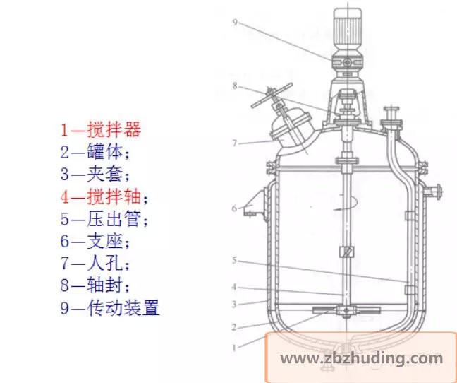 反應釜由釜體、釜蓋、夾套、攪拌器、傳動裝置、軸封裝置、支承等組成